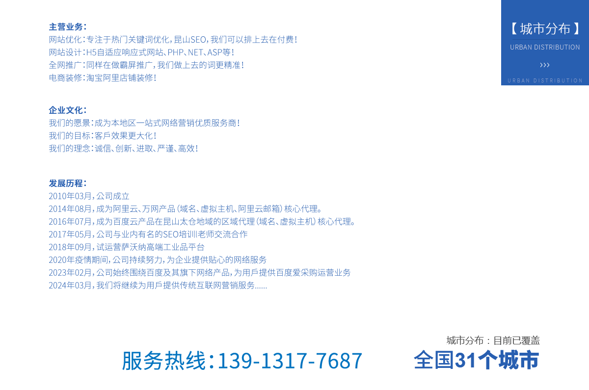 公司自成立以來,秉承“網(wǎng)絡天下,商機無限”的經營理念,始終堅持以質量為前提、以技術為根本、以客戶為中心的經營方針,提供本地化、專業(yè)化、高效率的網(wǎng)絡營銷服務。